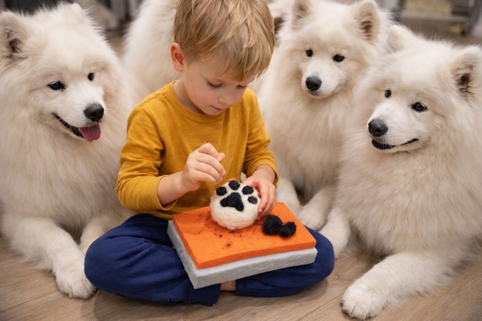 Вы уже пробовали создавать шедевры из шерсти или только ищете подходящее занятие? С любым из этих вариантов вам помогут Альбина, Артём и четыре пушистых друга-самоеда. На мастер-классе вы сможете не только позаниматься любимым хобби, но и расслабиться в прекрасной компании Пича, Чипа, Луи и Леи. На прошлом занятии вы обнимались и вычёсывали белых пушистиков, валяя памятные лапки. В этот раз мастер поможет вам не только повеселиться, но и «срисовать» мордашку или лапку понравившегося самоеда.